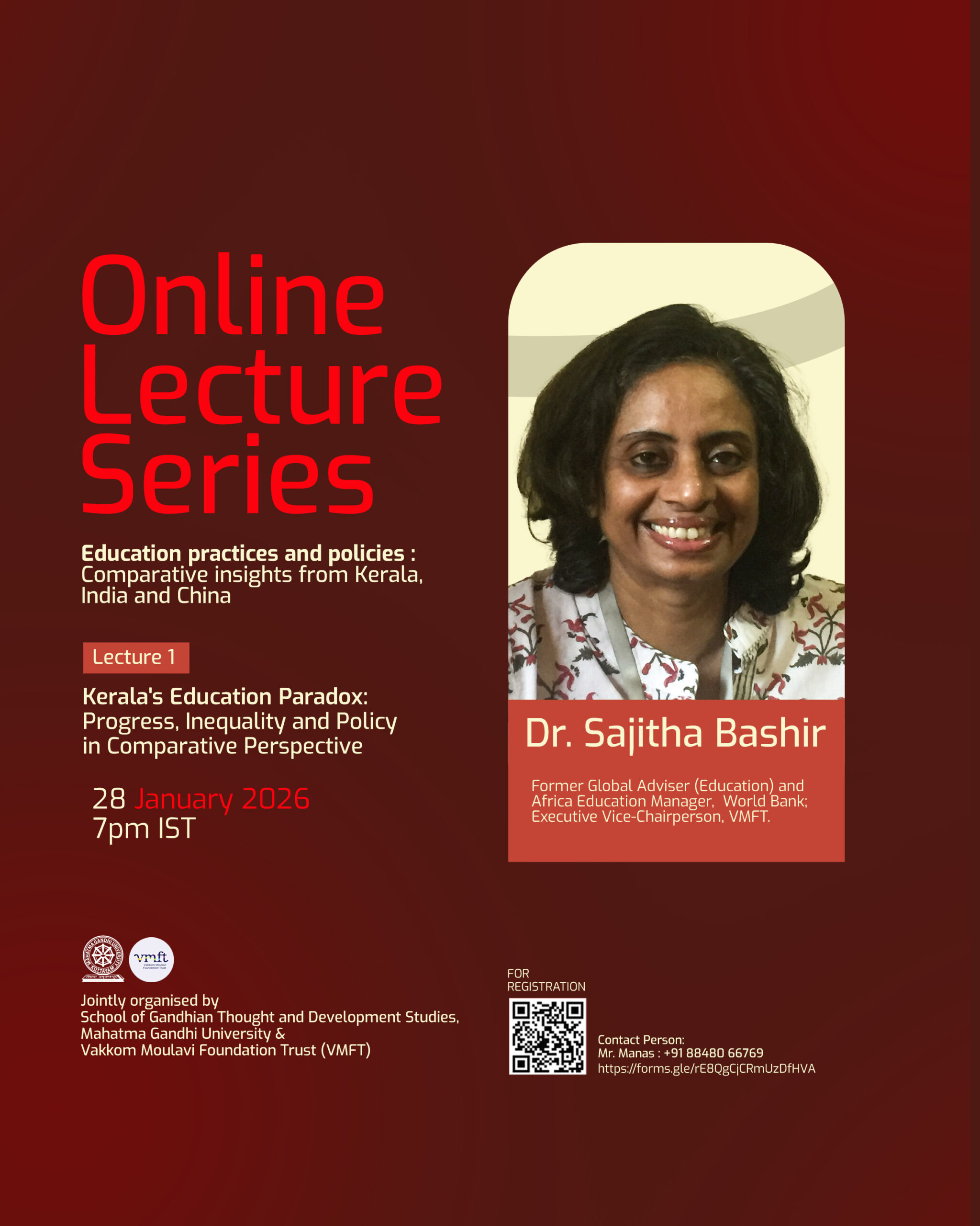 The first lecture, Kerala’s Education Paradox: Progress, Inequality and Policy in Comparative Perspective, will be delivered by Dr. Sajitha Bashir, former Global Adviser (Education) and Africa Education Manager at the World Bank.